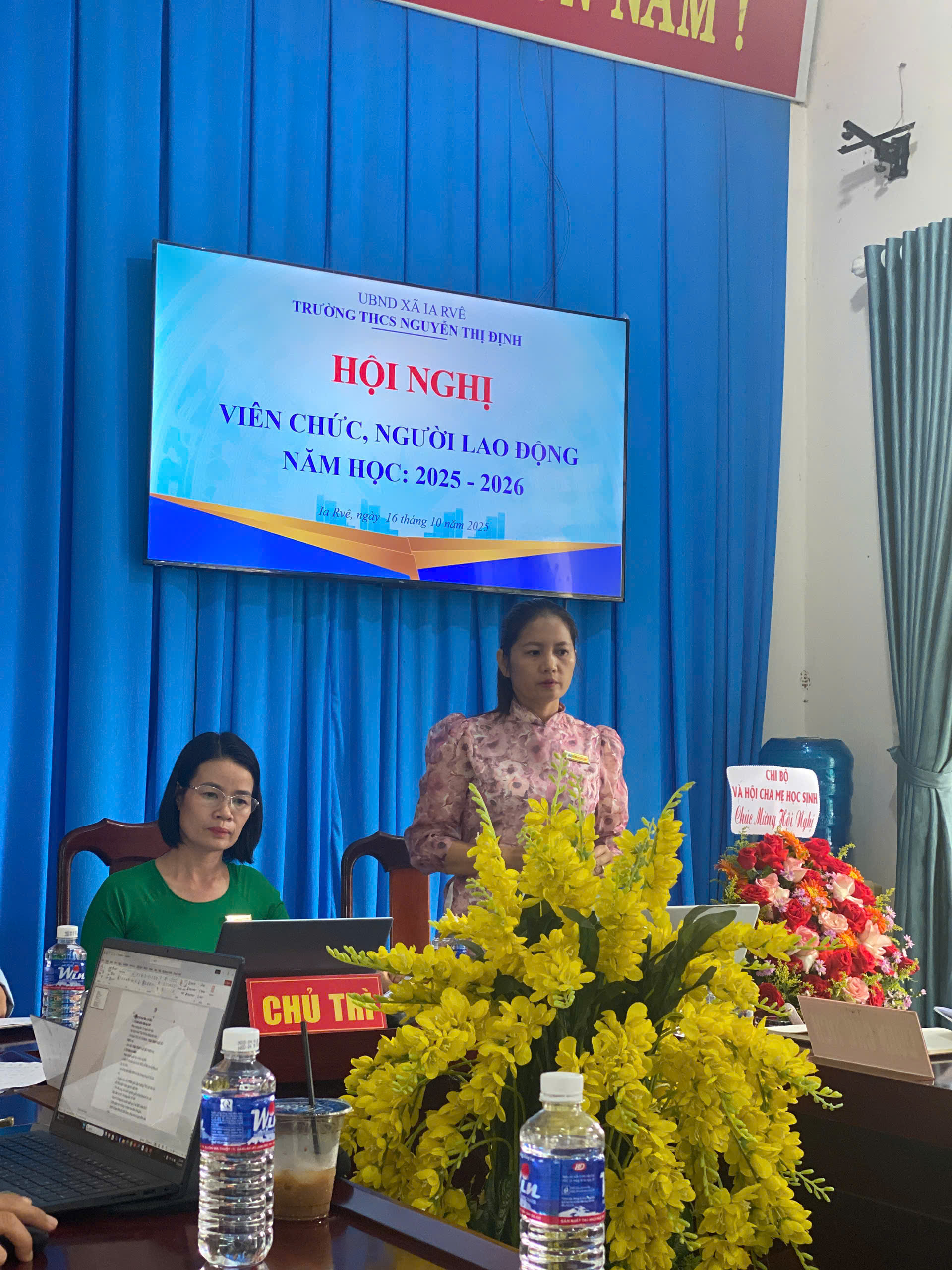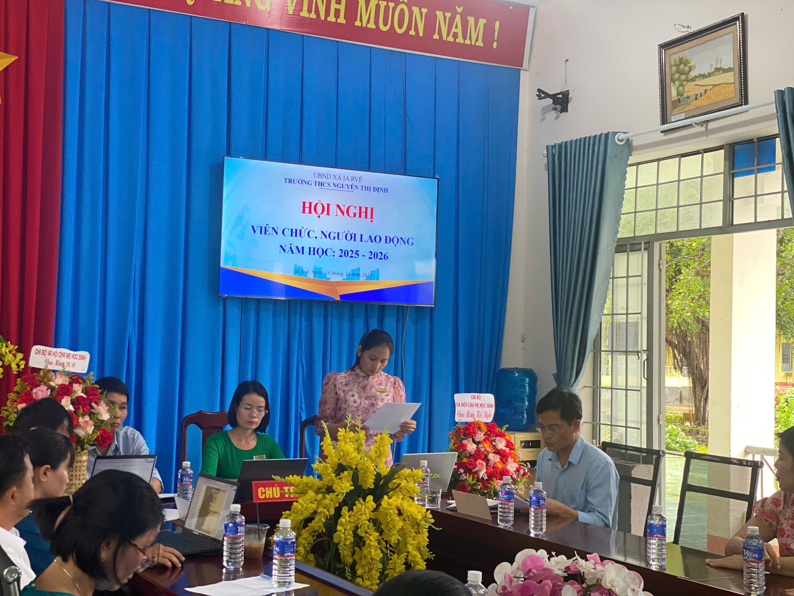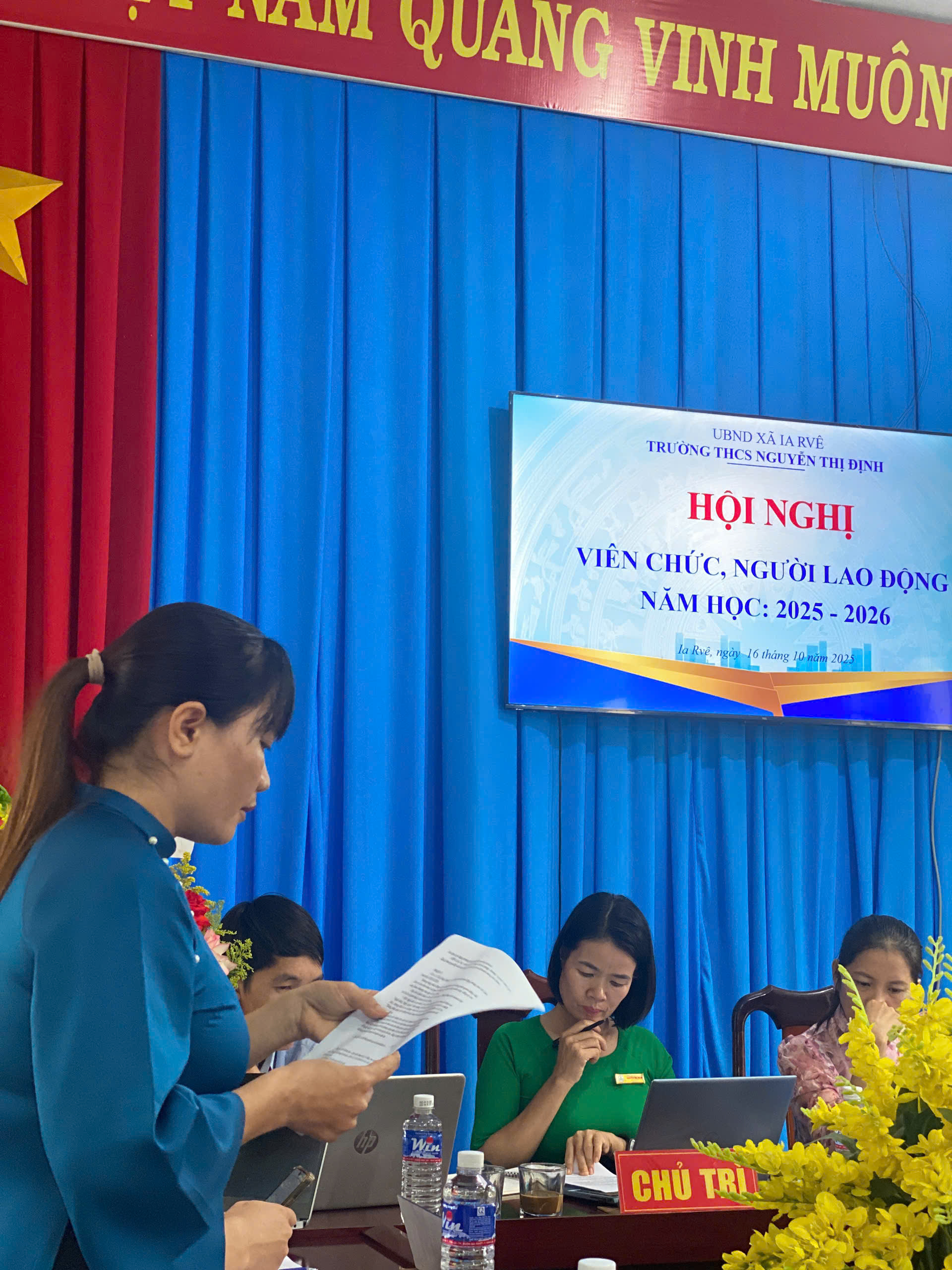 Ngày 16 tháng 10 năm 2025, Trường THCS Nguyễn Thị Định, xã Ia Rvê, tỉnh Đắk Lắk đã long trọng tổ chức Hội nghị viên chức – người lao động năm học 2025 – 2026. Đây là hoạt động thường niên có ý nghĩa quan trọng nhằm phát huy quyền làm chủ của cán bộ, giáo viên, nhân viên, người lao động trong nhà trường, đồng thời xây dựng kế hoạch thực hiện nhiệm vụ năm học mới.