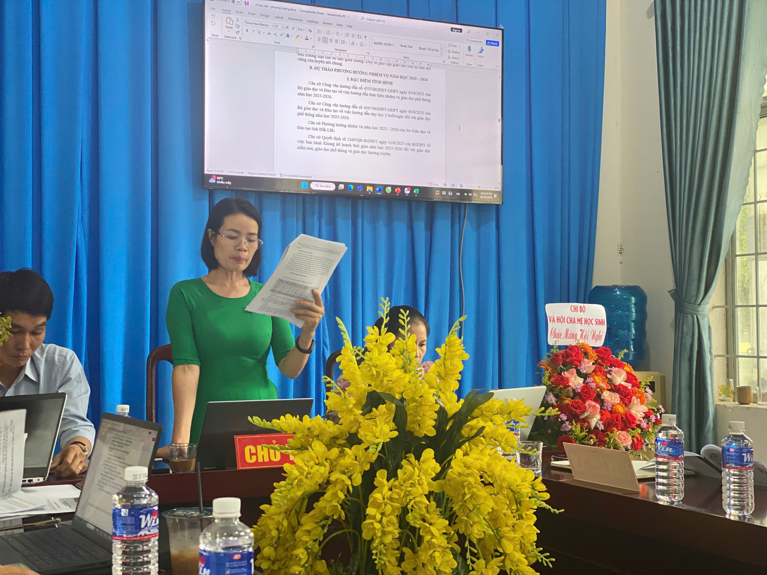 Tại hội nghị, cô Lê Thị Mai Hiên – Phó hiệu trưởng nhà trường đã trình bày Báo cáo tổng kết năm học 2024 – 2025, cô Nguyễn Thị Trâm – Hiệu trưởng nhà trường trình bày Phương hướng, nhiệm vụ năm học 2025 – 2026. Báo cáo nêu rõ những kết quả đạt được trong công tác dạy học, giáo dục học sinh, các hoạt động trải nghiệm, công tác xã hội hóa giáo dục cũng như những mặt còn hạn chế cần khắc phục.