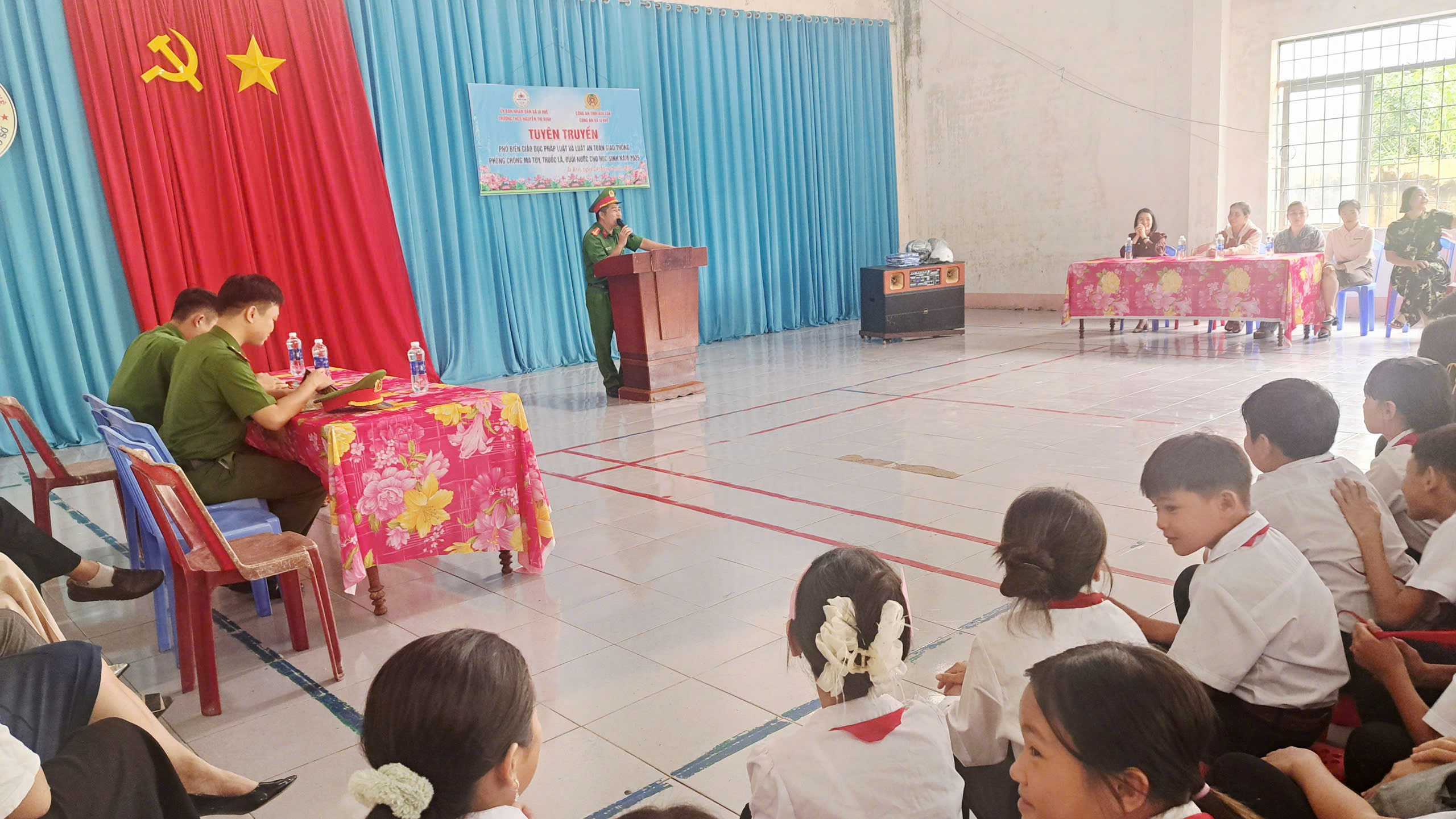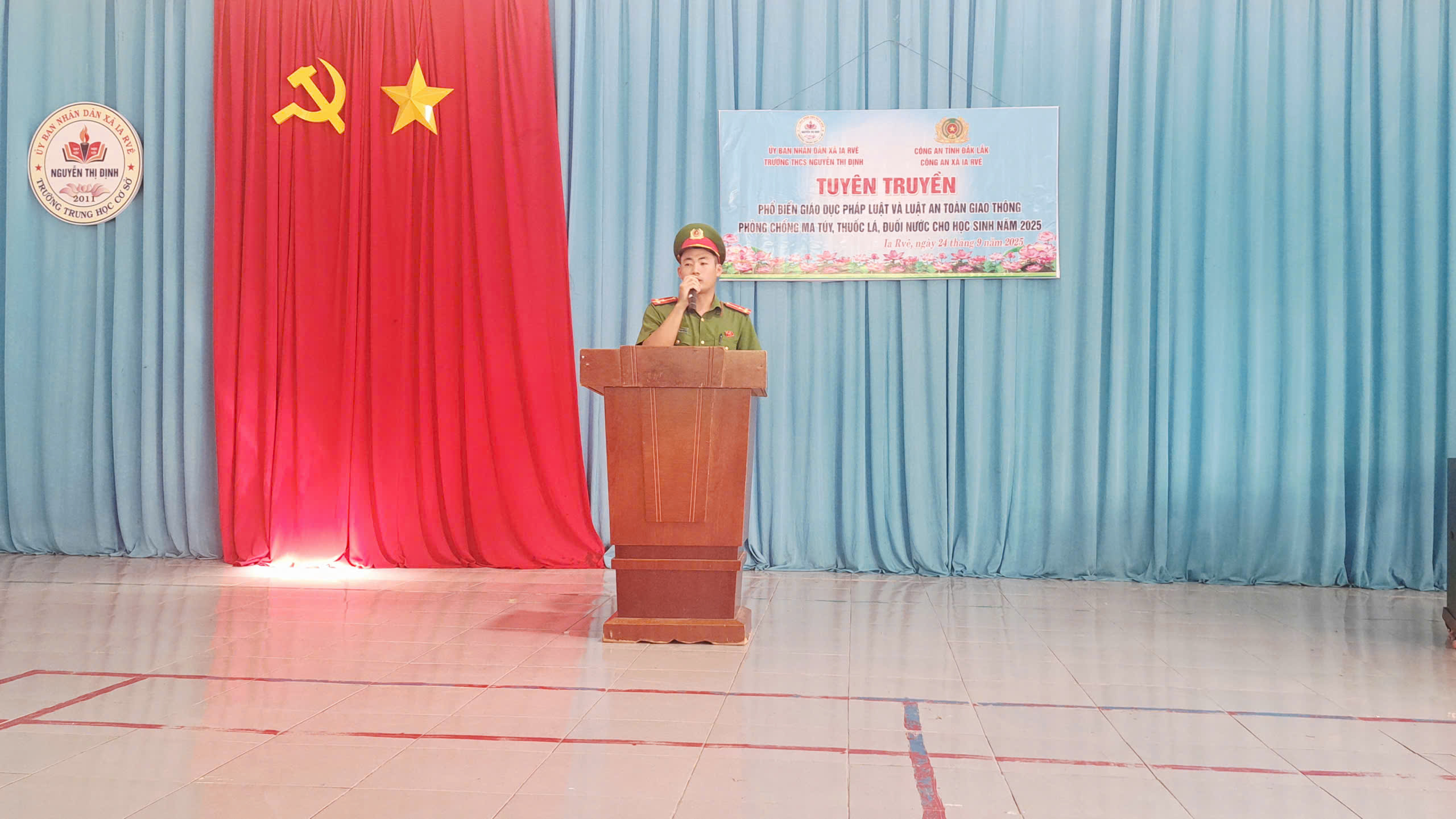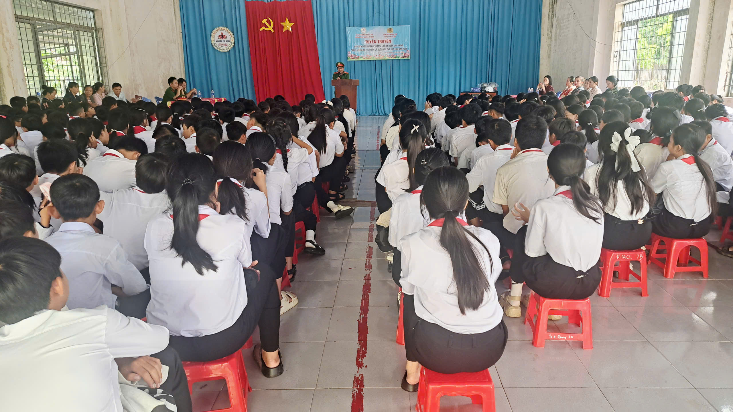 Thực hiện theo công văn số: 219/UBND-VHXH, ngày 22 /9/2025 của UBND xã Ia Rvê về triển khai hoạt động Dự án “Tăng cường năng lực phòng, chống ma tuý trong trường học đến năm 2025” . Vào lúc 13h 30 phút ngày 24 tháng 09 năm 2025, Liên đội THCS Nguyễn Thị Định đã phối hợp cùng lực lượng Công an xã Ia Rvê tổ chức tuyên truyền đến toàn thể học sinh trong việc nghiêm chỉnh chấp hành pháp luật về phòng, chống ma tuý năm học 2025. Về dự với buổi tuyên truyền, nhà trường đã mời 10 phụ huynh đại diện cho 10 chi đội, cùng toàn thể cán bộ giáo viên, nhân viên của nhà trường và đông đủ 322 học sinh tham gia.
